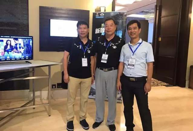 海南省酒店工程协会会长\大中华酒店工程师协会海南分会会长李晓东(中)、海南省酒店工程协会秘书长\大中华酒店工程师协会海南分会秘书长刘国阳(左)在盛阳科技智慧酒店产品演示区与陈福运合影。